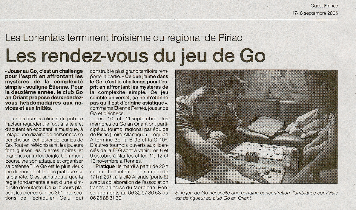 Le club de Go de Lorient organisera le samedi 28 janvier 2006 le premier tour du championnat de France (phase locale). Nous invitons les clubs de Concarneau, de Baye, de Vannes et de Questembert, à profiter de cette occasion pour organiser le leur. Cette phase locale est réservée aux licenciés à jour de leurs cotisations.