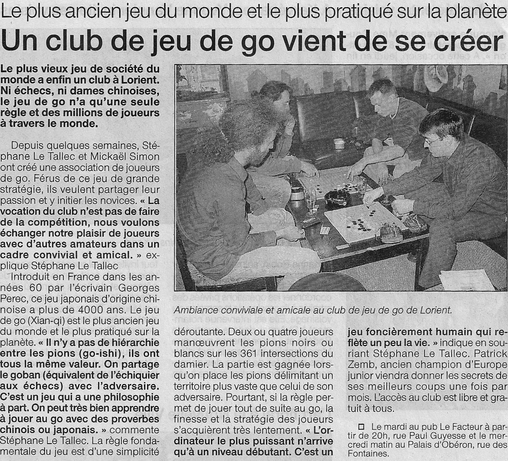 Objet : réunir les personnes désirant jouer au jeu de go et leur permettre de faire la promotion de ce jeu.Siège social : 6 D, rue Esnoult-des-Châtelets, 56100 Lorient. Date de la déclaration : 13 avril 2004
